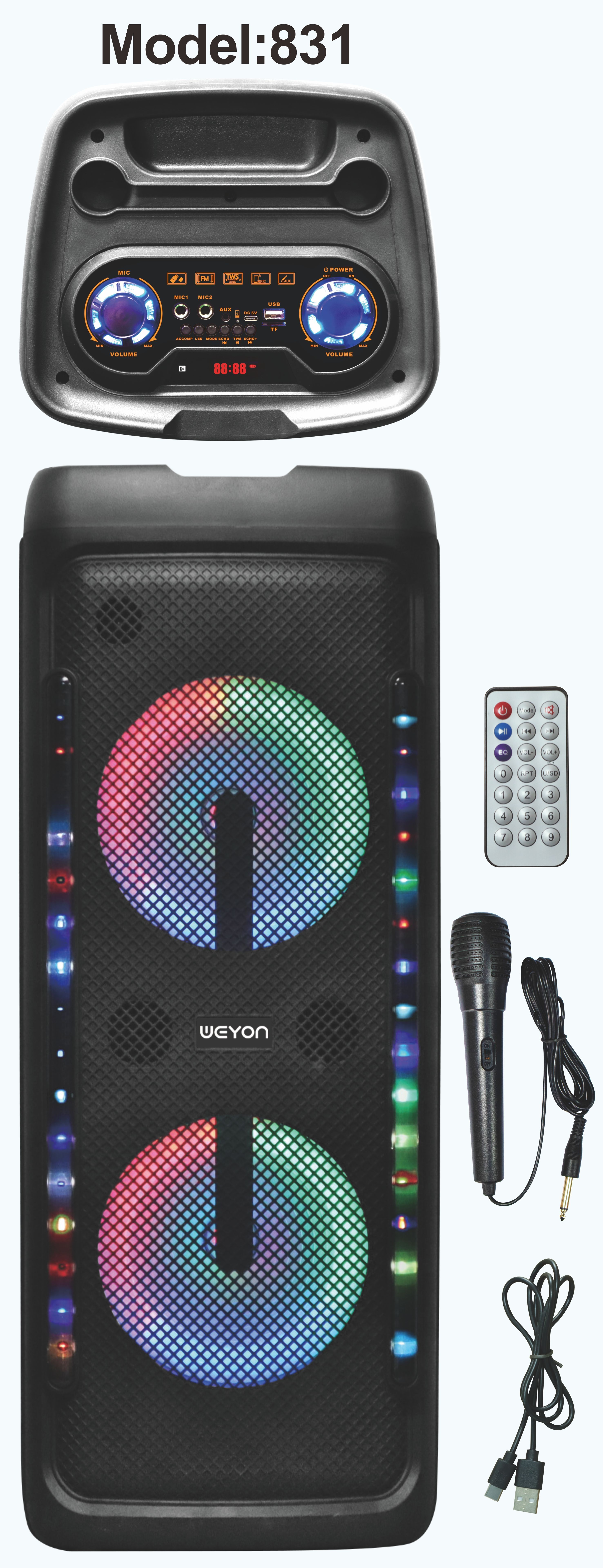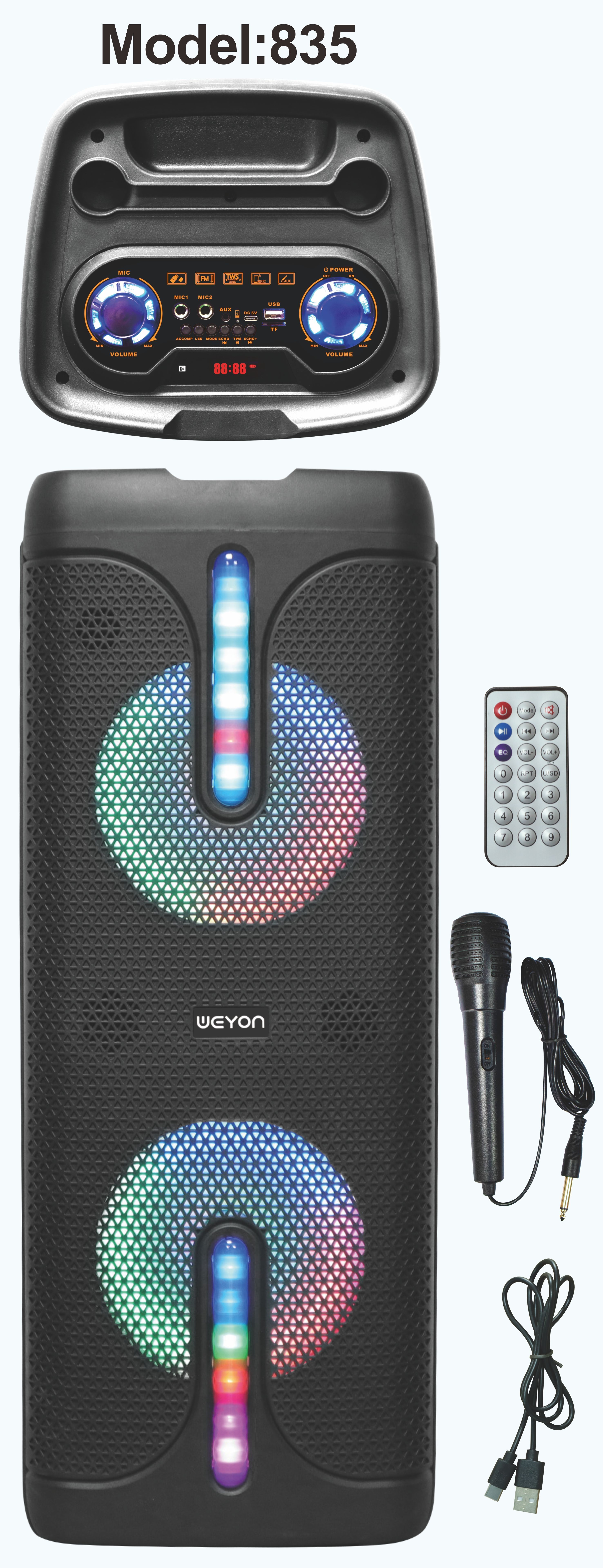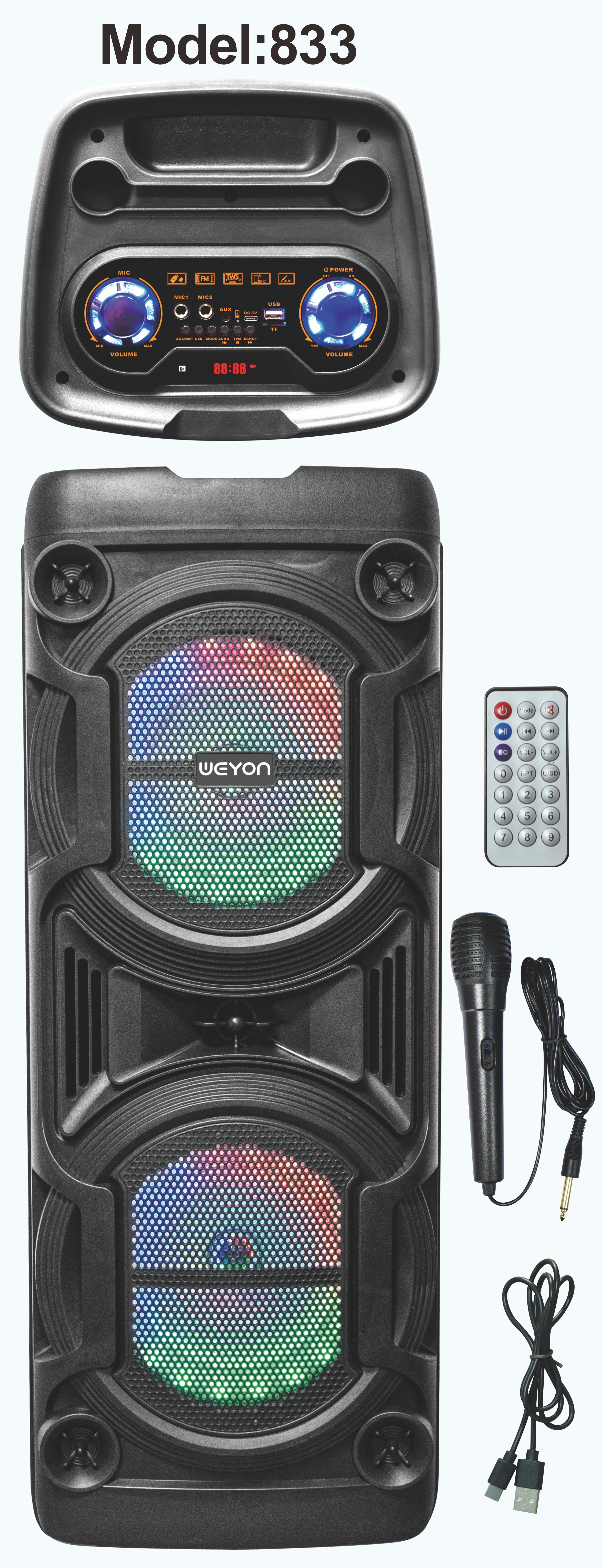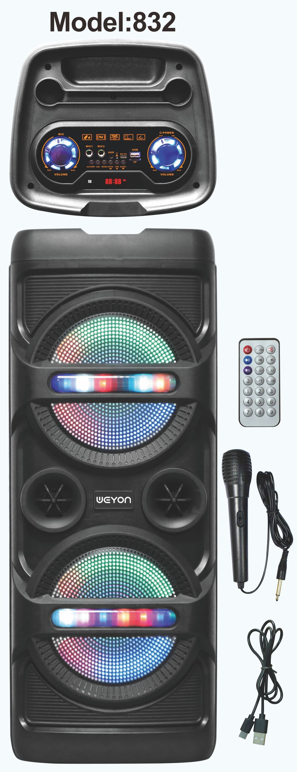 Function: Bluetooth, 1+1 couplet, USB, TF, FM, AUX, Microphone
